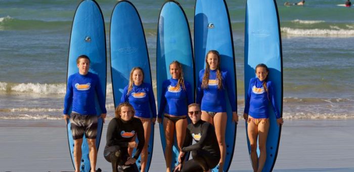 We meet at our trailer in the car park 15 minutes before the lesson to allow time to change into bathers and rashie or wetsuit and select the right size board depending on your size and experience. Then we walk onto the beach and begin with a safety breifing and basic instruction. After catching your first few waves we will return to the beach for some more detailed instruction on stand up techniques. The remainder of the time will be spent in the water with the instructor helping everyone to stand up. We then walk back to the trailer with the boards and use the beach showers to rinse off the sand and salt.